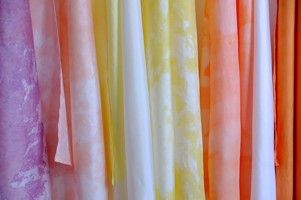En résumé : Préparation de plusieurs bains de teinture, réalisation d'échantillons et nuançage de leur couleur, teinture d'une pièce de soie de 50cm x 50cm.